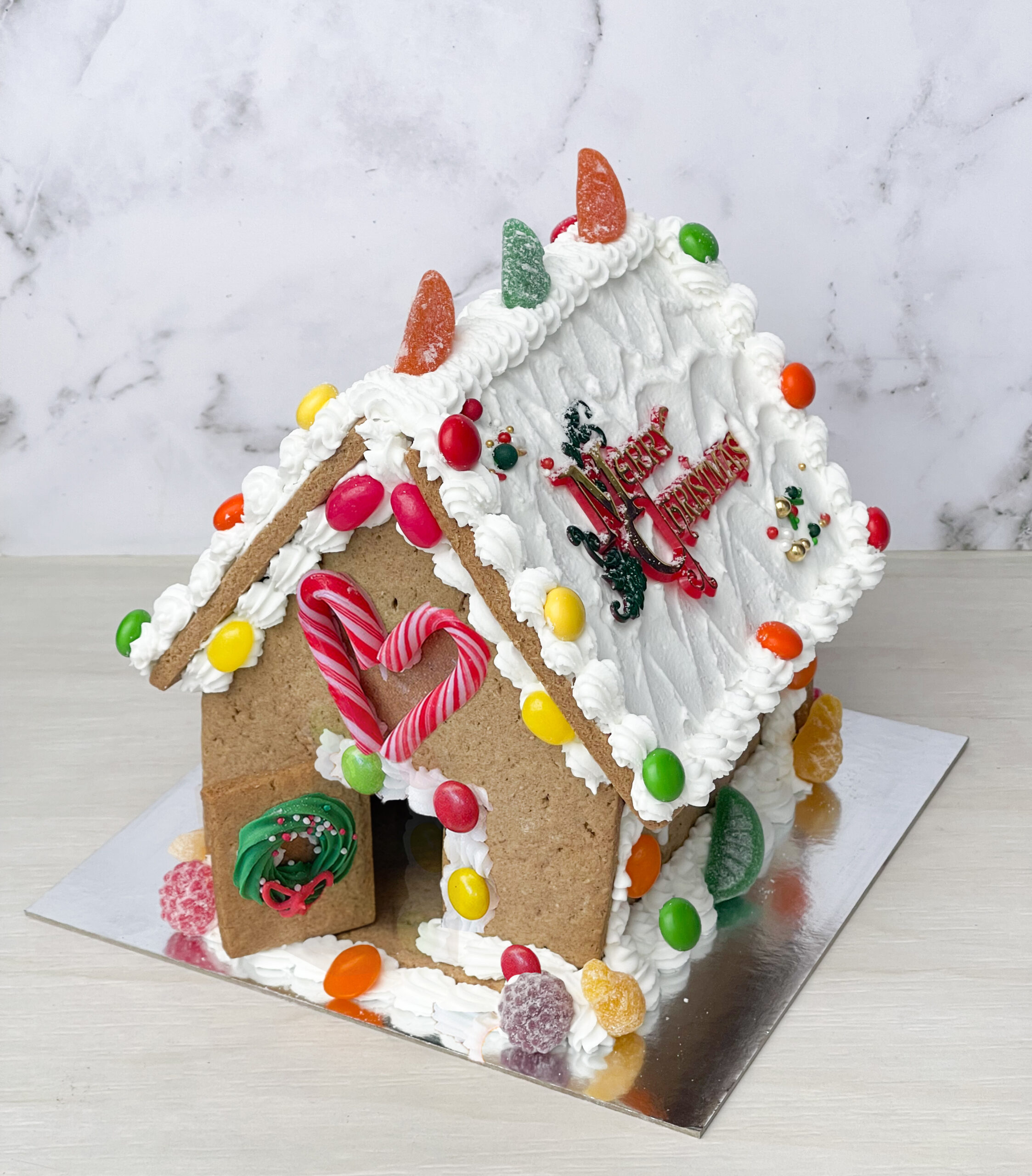 A real Christmas favorite, our well loved gingerbread cottage decorated with a traditional Christmas theme and lots of yummy sweet.